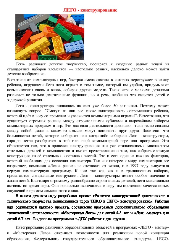 прилагаются специальные инструкции. Лего – конструкторы имеют особое значение в