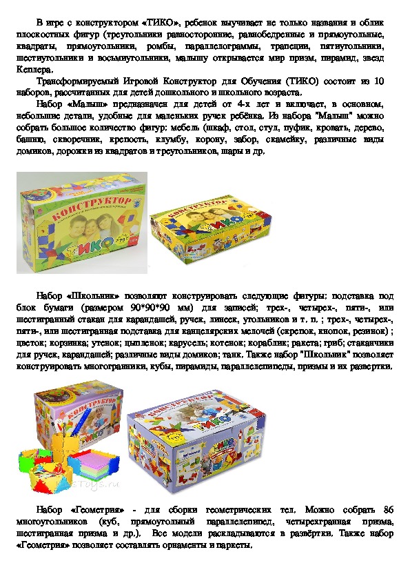 осьминога, снеговика и т. д.В игре с конструктором «ТИКО», ребенок выучивает не только названия и облик