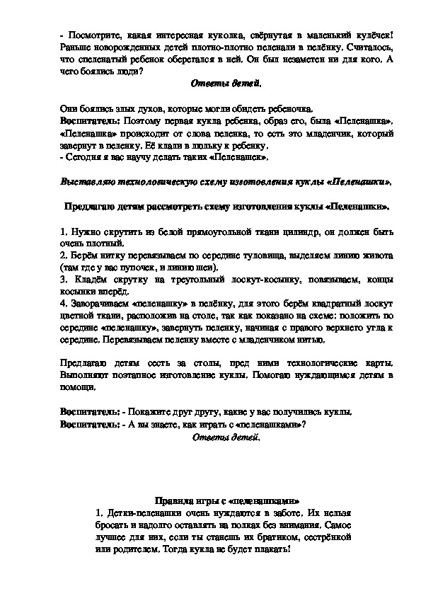 Программное содержание: научить детей изготавливать куклу «пеленашку»