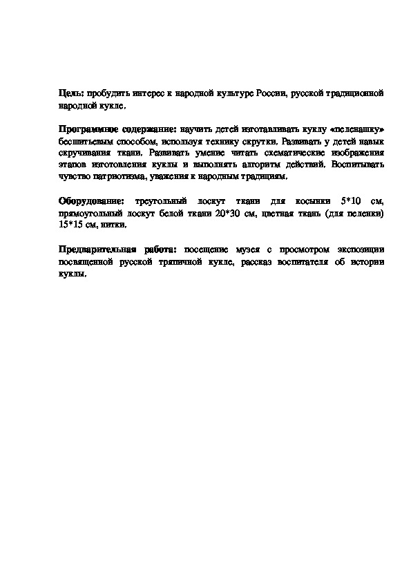 Научить детей изготавливать куклу «пеленашку» бесшитьевым способом, используя технику скрутки. Развивать у детей навык скручивания ткани. Развивать умение читать схематические изображения этапов изготовления куклы и выполнять алгоритм действий. Воспитывать чувство патриотизма, уважения к народным традициям.