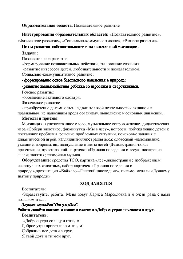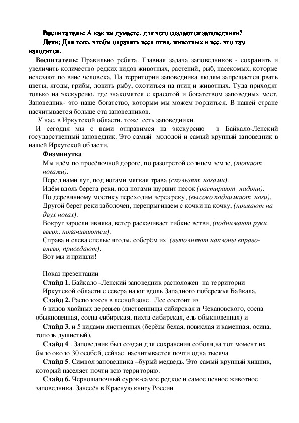 На занятии дети познакомятся с Байкало-Ленским государственным заповедником,его редких обитателях. Узнают по каким причинам исчезли некоторые виды птиц и животных.Вспомнят правила поведения в природе.