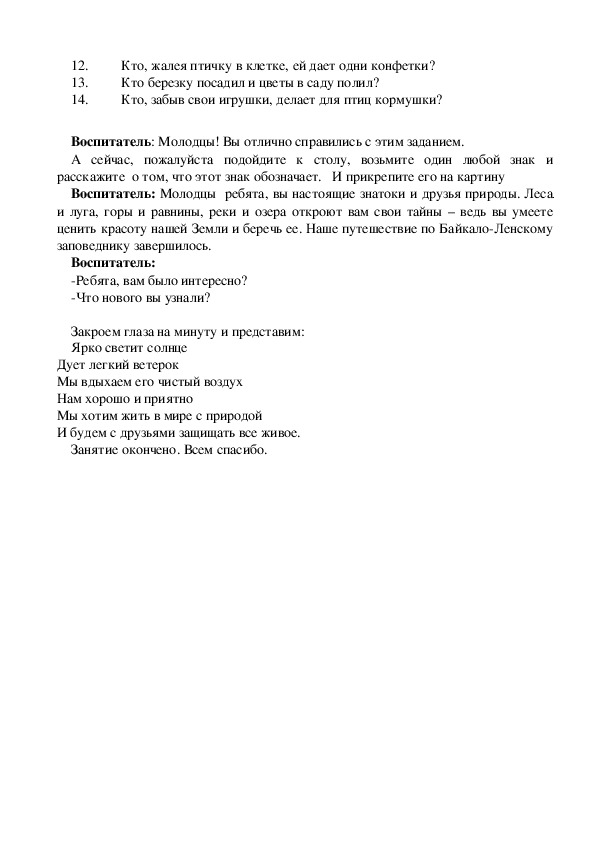 Воспитатель: Молодцы ребята, вы настоящие знатоки и друзья природы. Леса