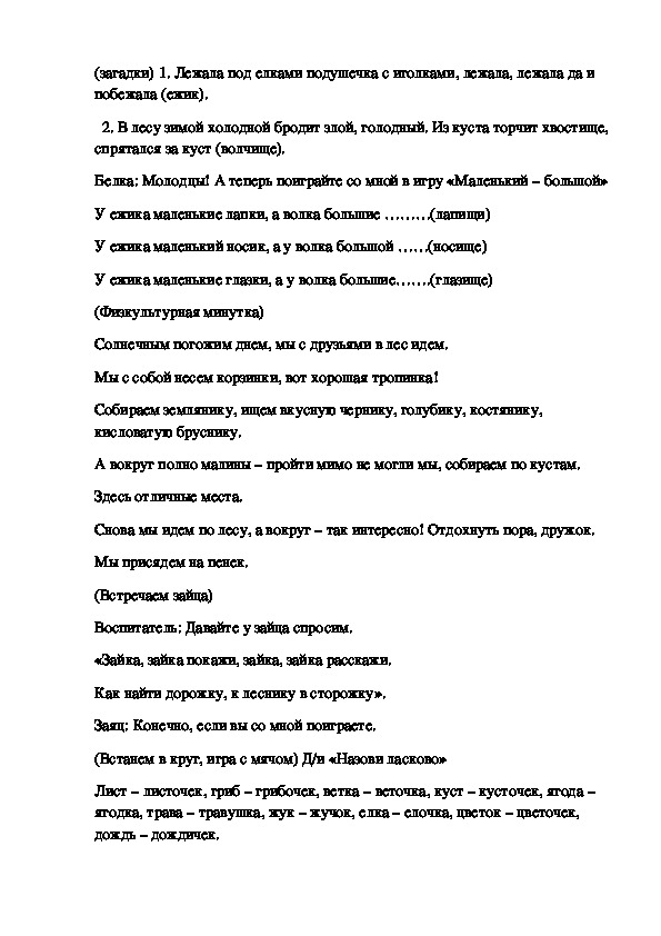 Воспитатель: Ребята, у белки есть друзья. Отгадайте, кто?(загадки) 1. Лежала под елками подушечка с иголками, лежала, лежала да и