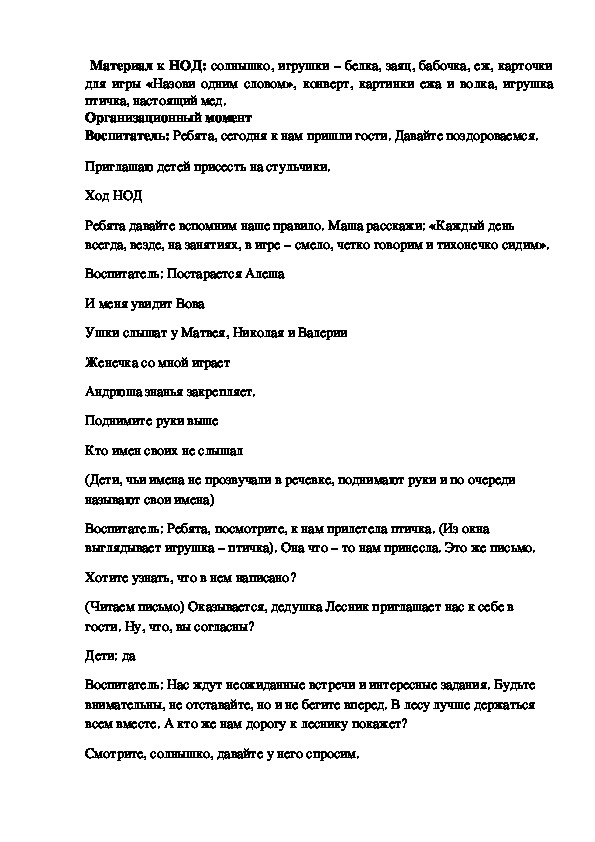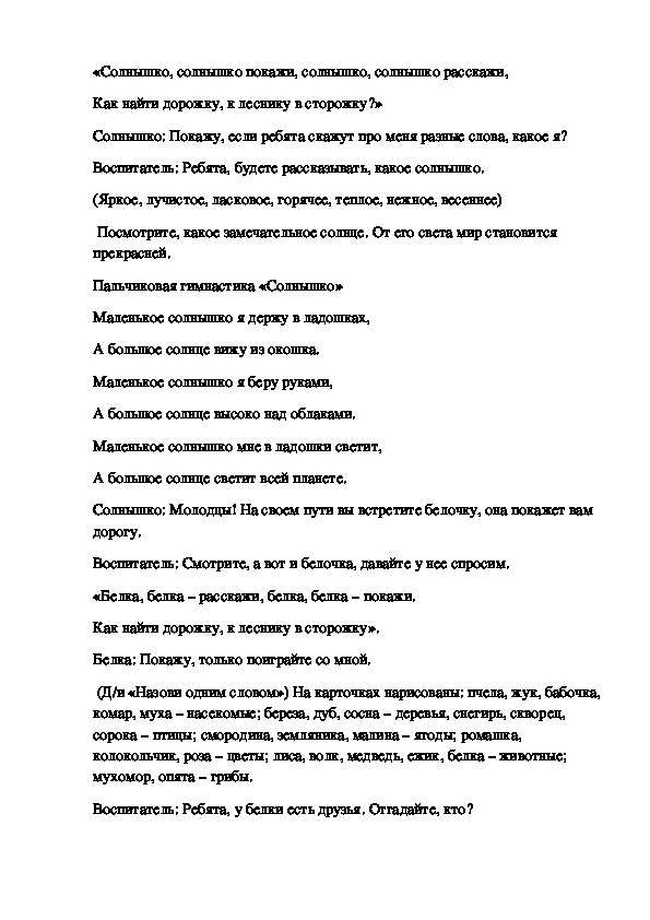 коммуникативная,Материал к НОД: солнышко, игрушки – белка, заяц, бабочка, еж, карточки