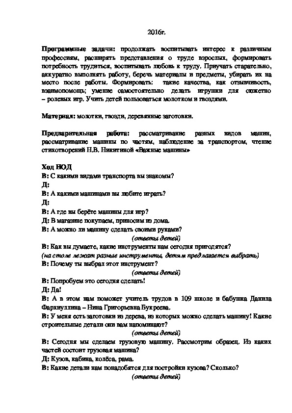 Продолжать воспитывать интерес к различным профессиям, расширять представления о труде взрослых, формировать потребность трудиться, воспитывать любовь к труду. Приучать старательно, аккуратно выполнять работу, беречь материалы и предметы, убирать их на место после работы. Формировать: такие качества, как отзывчивость, взаимопомощь; умение самостоятельно делать игрушки для сюжетно – ролевых игр. Учить детей пользоваться молотком и гвоздями.