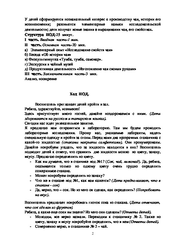 деятельности; дети получат новые знания о выращивании чая, его свойствах.