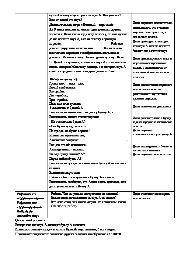 Тақырып /Тема /Theme: Звук [а] и буквы А ,а Цель: Знать звук [а] и буквы А ,а Мақсаты/ Задачи/ Problem: познакомить детей с гласной буквой А ,а -формировать умение выделять звук [а] в словах ,находить его место в слове (начало ,середина ,конец) -дифференцировать понятие «звук»-«буква» -развивать мелкую моторику руки, внимание ,память -воспитывать выдержку ,самостоятельностьконспект