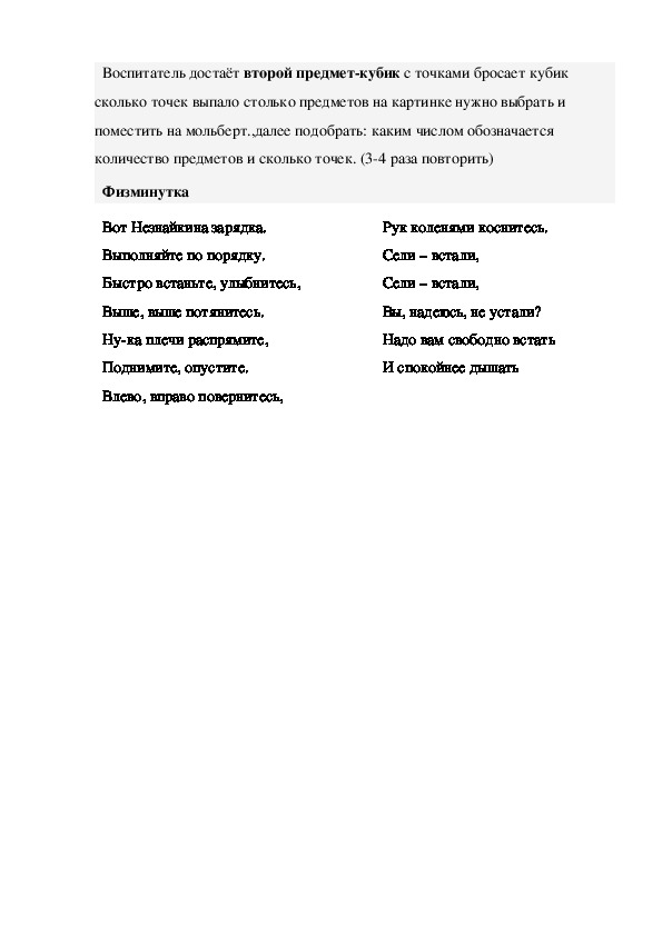 Незнайка ты запомнил, попробуй ты ответитьВоспитатель достаёт второй предметкубик с точками бросает кубик