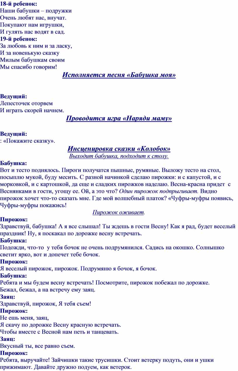 Стол, тесто, пирожки, скатерть; Шапочки - зайца, волка, медведя, лисы; Костюм Колобка; Костюм Весны; Фартук, платок – для Бабушки; Бижутерия : браслет – 2 шт, бусы – 2 шт, шляпки – 2 шт, шарфы – 2 шт; Корзина с конфетами; Цветы двух цветов – одинаковое количество каждого цвета.