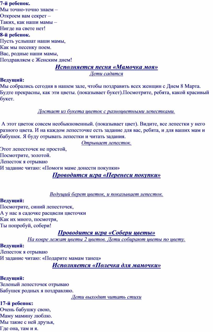 А этот цветок совсем необыкновенный. (показывает цвет). Видите, все лепестки у него разного цвета. И на каждом лепесточке есть задание для вас, ребята, и для ваших мам и бабушек. Я буду отрывать лепестки и читать задания.