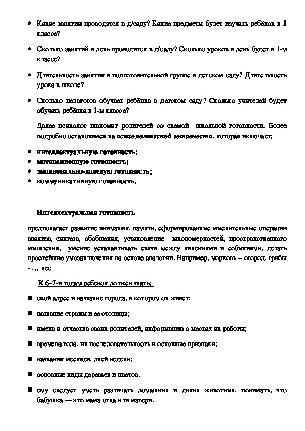 Примерные вопросы: Какие занятии проводятся в д/саду? Какие предметы будет изучать ребёнок в 1