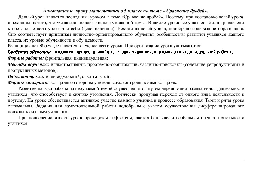 Данный урок является последним уроком в теме «Сравнение дробей». Поэтому, при постановке целей урока, я исходила из того, что учащиеся владеют основами данной темы. В начале урока все учащиеся были привлечены к постановке цели урока для себя (целеполагание). Исходя из целей урока, подобрано содержание образования. Оно соответствует принципам личностно-ориентированного обучения, особенностям развития учащихся данного класса, их уровню обученности и обучаемости.