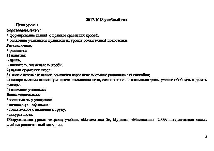 Данный урок является последним уроком в теме «Сравнение дробей». Поэтому, при постановке целей урока,