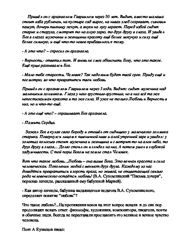 – А сейчас попробуйте дать краткое определение: “Любовь – это…” (Отвечают).