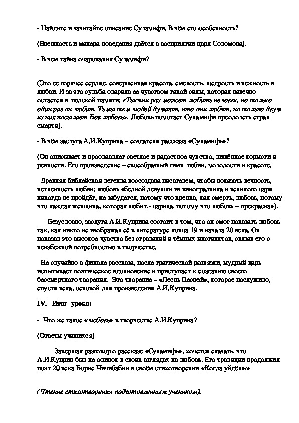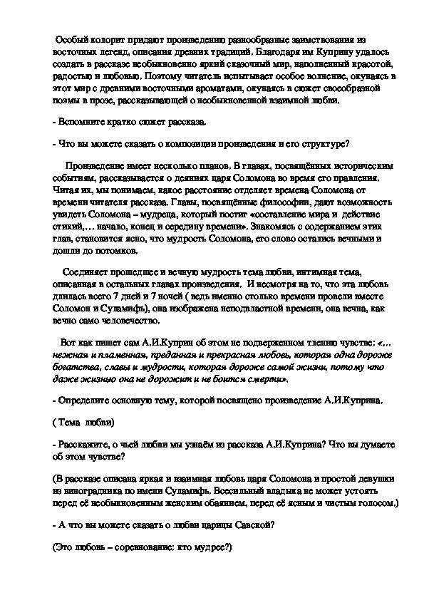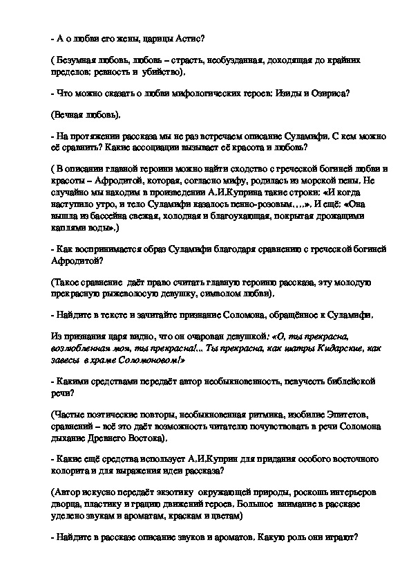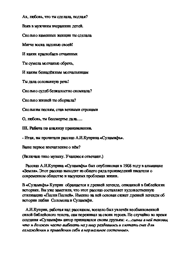 • Раскрыть своеобразие интерпретации Куприным темы любви на примере повести «Суламифь» с учётом особенностей её художественного воплощения.