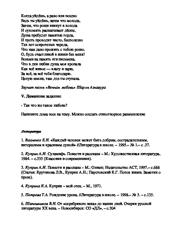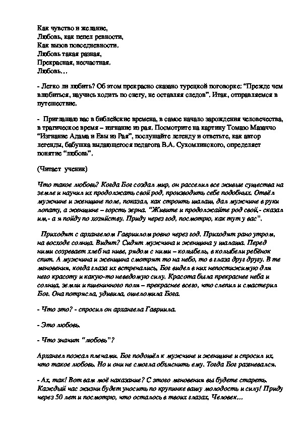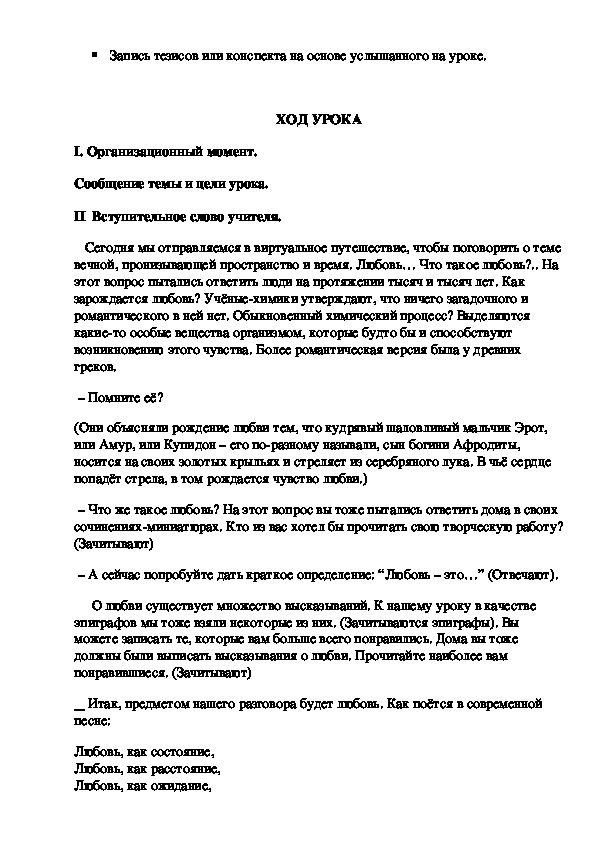 • Воспитывать в юношах рыцарское отношение к женщине, формировать у школьников представление о любви как высоком и прекрасном чувстве.конспект