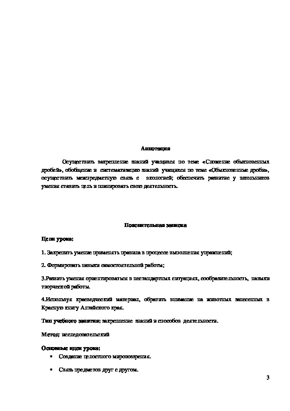 Осуществить закрепление знаний учащихся по теме «Сложение обыкновенных дробей», обобщение и систематизацию знаний учащихся по теме «Обыкновенные дроби», осуществить межпредметную связь с экологией; обеспечить развитие у школьников умения ставить цель и планировать свою деятельность.