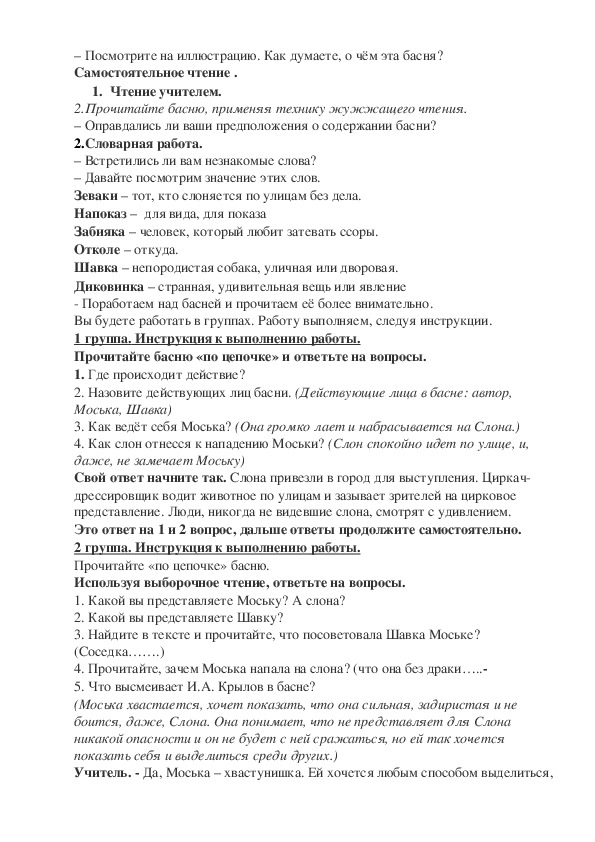 Цель урока: Познакомить детей с басней И.А. Крылова “Слон и Моська”.