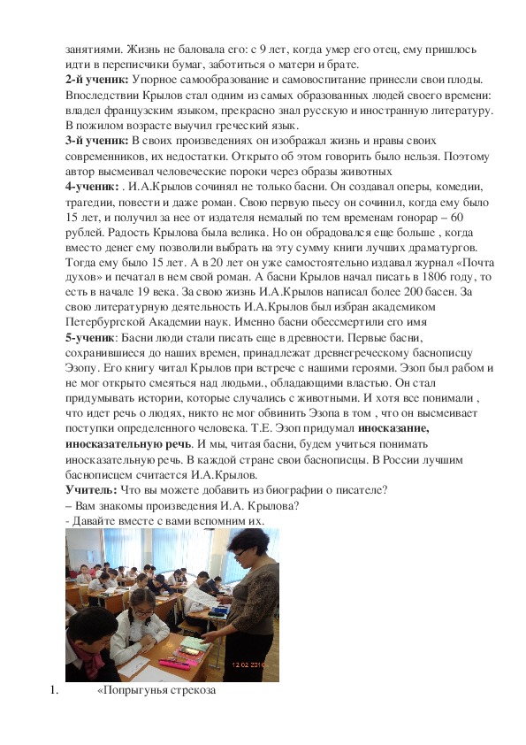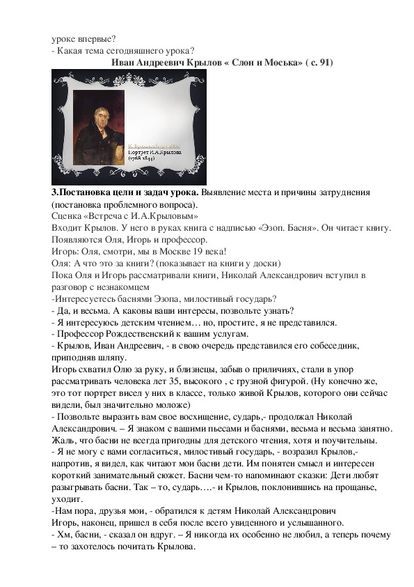 Учитель. Сегодня мы знакомимся с басней Ивана Андреевича Крылова. “Слон и