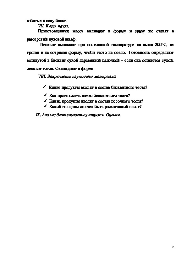 воспитывать трудолюбие, уважение к хлебу.Бисквитное тесто - тесто пышной консистенции, светлого кремового оттенка. Хорошо выпеченное изделие из этого теста имеет тонкую гладкую (местами бугорчатую) верхнюю корочку золотисто-желтого цвета. Структура: мякина пышная, пористая, эластичная. Это тесто самое легкое и пышное. Из этого теста изготавливают торты, пирожные.