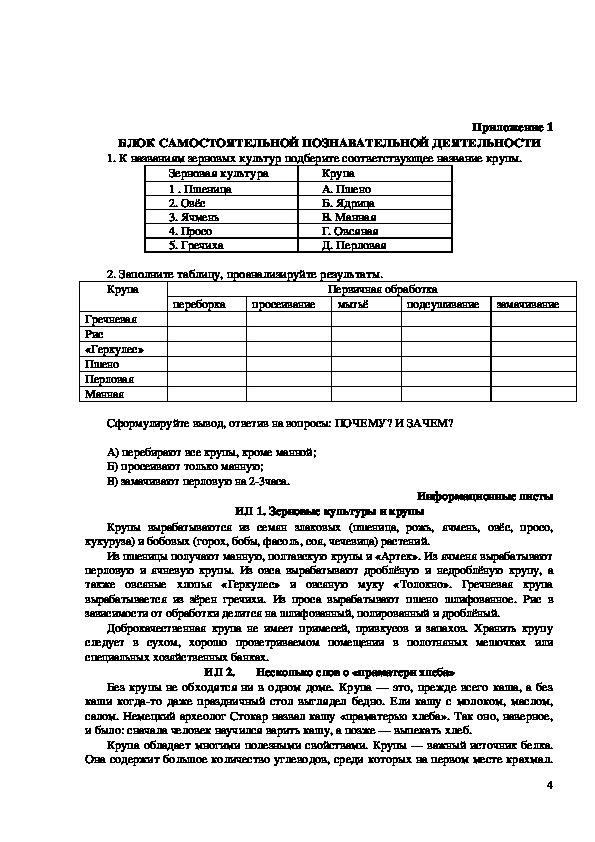 ознакомление учащихся с видами круп и их первичной обработкой;