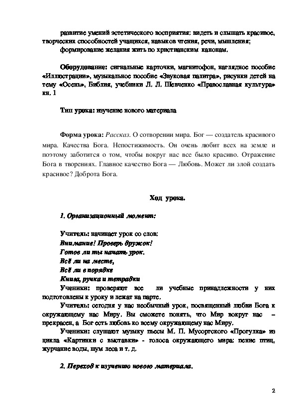 Форма урока: Рассказ. О сотворении мира. Бог — создатель красивого