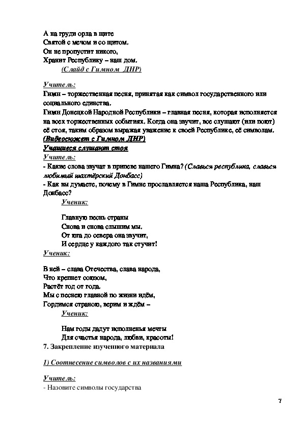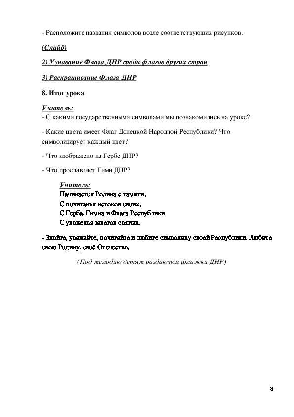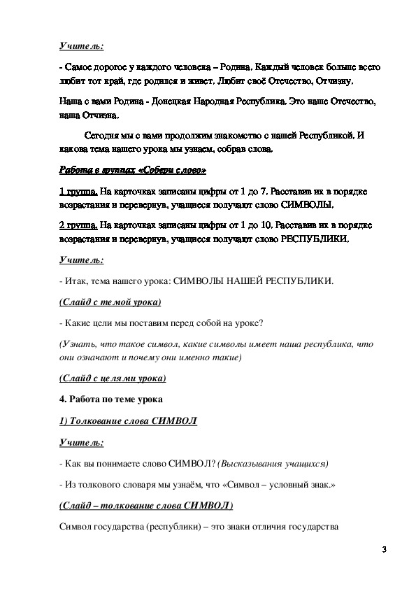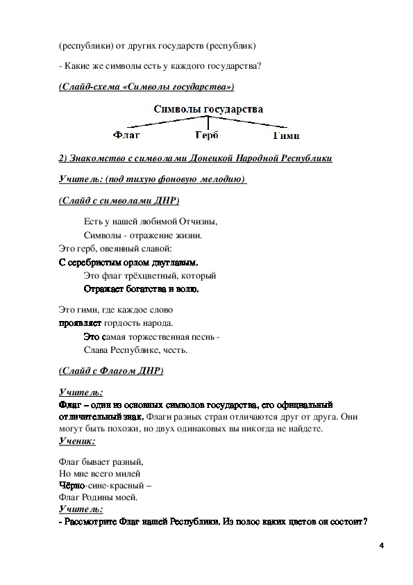 ЦЕЛИ УРОКА: раскрыть понятие «символ», сформировать первоначальные представления учащихся о Донецкой Народной Республике как Родине, о гербе, флаге, гимне как символах Республики, развивать речь учащихся, логическое мышление, умения узнавать государственную символику, соотносить символ с информацией о нём, воспитывать патриотизм, уважение к государственной символике как проявление уважения к своей Республике.Конспект урока "Что такое символы? Символы моей Республики" 1 класс
