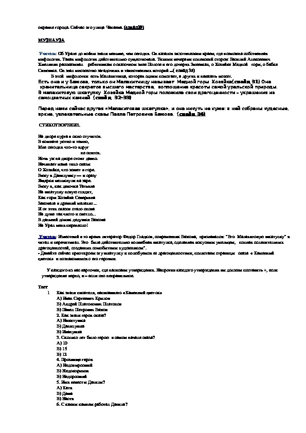 Давайте сейчас приоткроем эту шкатулку и полюбуемся ее драгоценностями, полистаем страницы сказа « Каменный