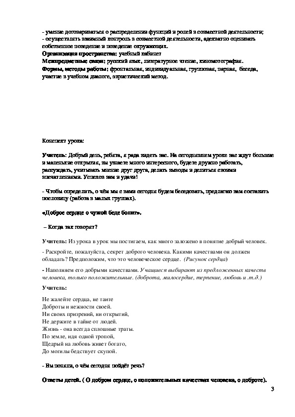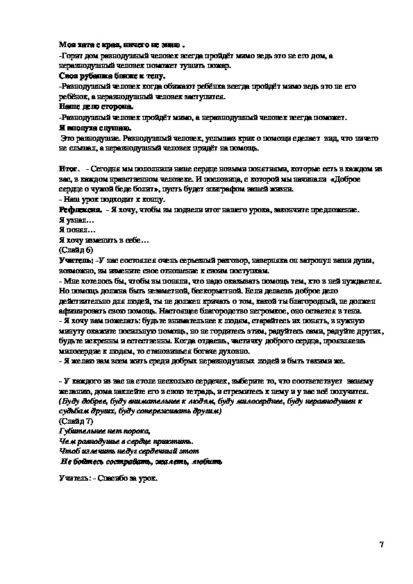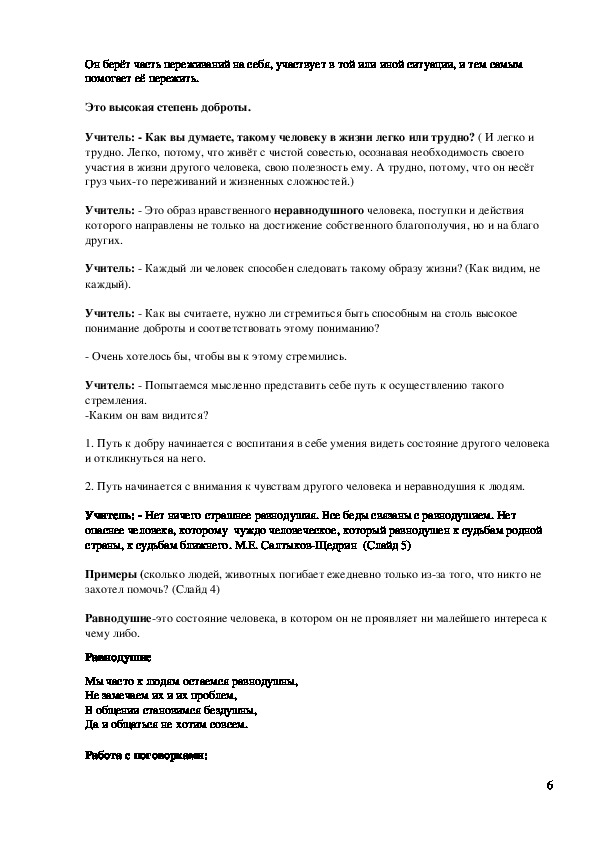 Цели:1) Обучающие: углублять представление учащихся о нрав¬ственных качествах человека, формировать представление детей о губительности и преступности равнодушия людей по отношению к ближним, к окружающей действительности; формировать знания о понятиях сострадание, сочувствие, сопереживание, соучастие.