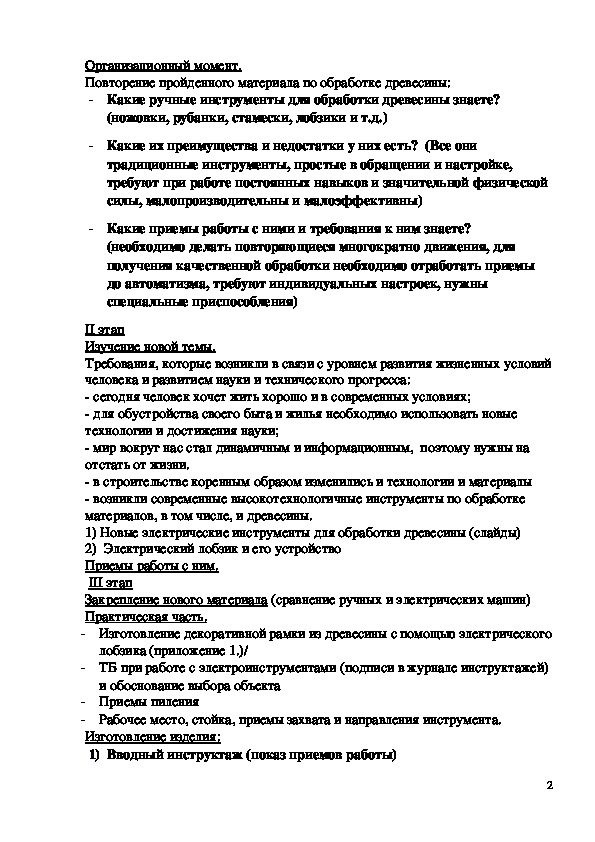 Цели: Создать условия для получения знаний обучающимся о современных электрических инструментах для обработки древесины, о приемах работы с ними, о технологии обработки древесины с помощью электроинструментов; получение исходных умений и навыков по работе с электрическим лобзиком; воспитание любви к труду и эстетичности.