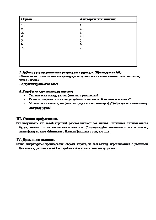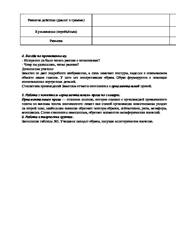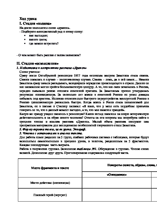 Оборудование: портрет Е.Замятина, тексты рассказа, рабочие листы с таблицами, ксерокопии