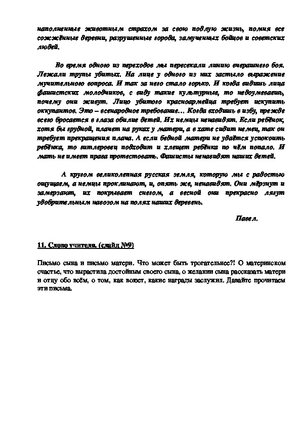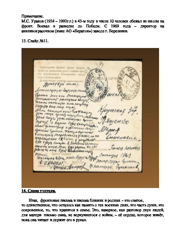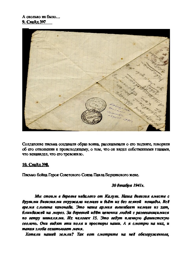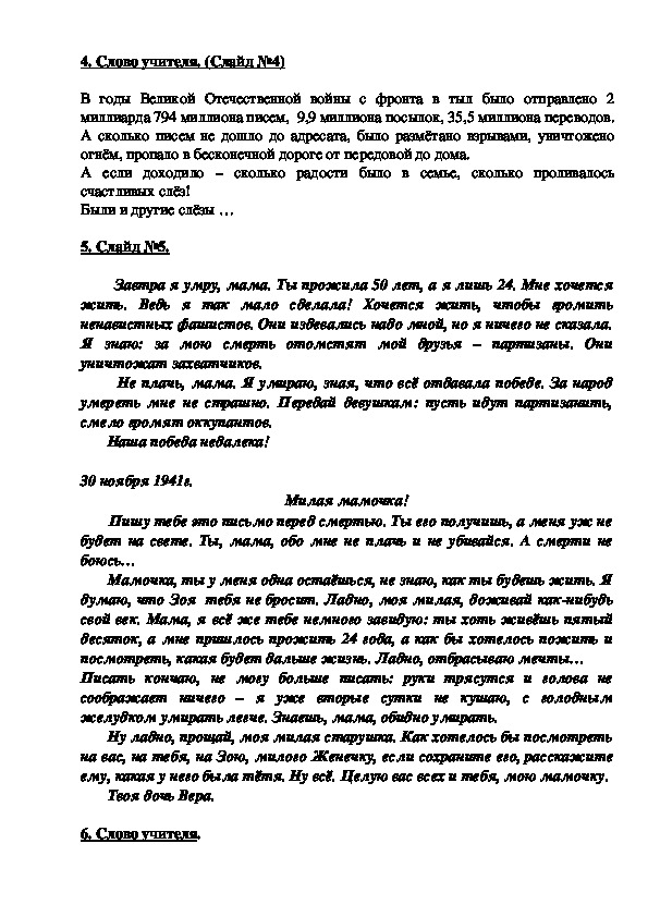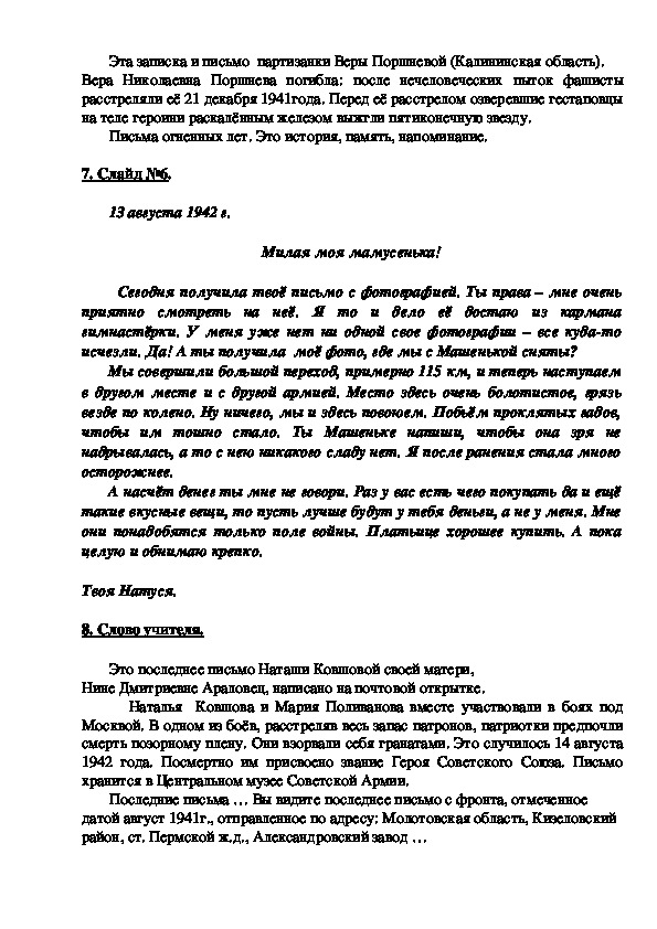 6. Слово учителя.Эта записка и письмо партизанки Веры Поршневой (Калининская область).