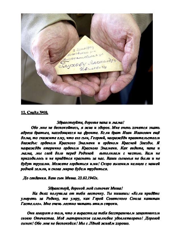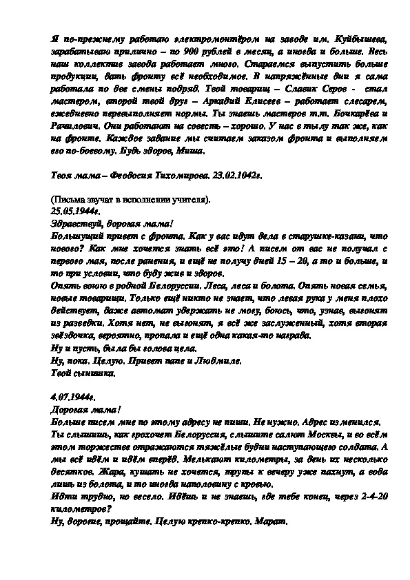 солдата, понять его настроение, мысли, чувства. Письма, написанные огрызкамикарандашей в окопах, блиндажах, госпиталях, доходили до адресата, они словно