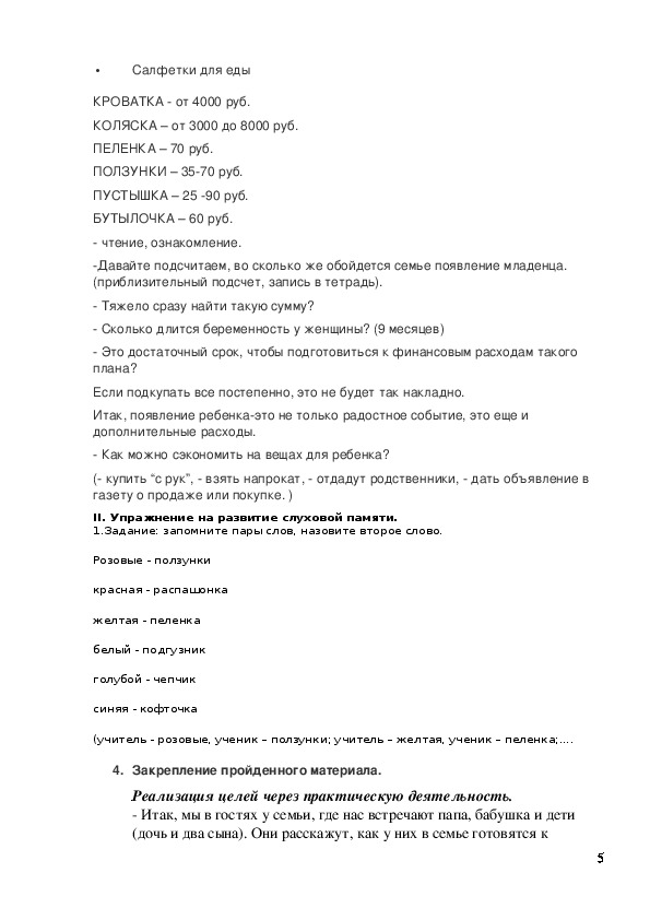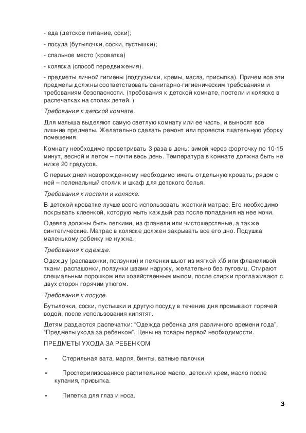 1. Ознакомление с анатомо-физиологическими особенностями грудного ребенка, с требованиями к детскому оборудованию; со средними ценами на одежду и предметы первой необходимости.