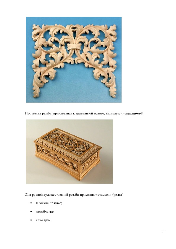 6Прорезная резьба, приклеенная к деревянной основе, называется накладной.