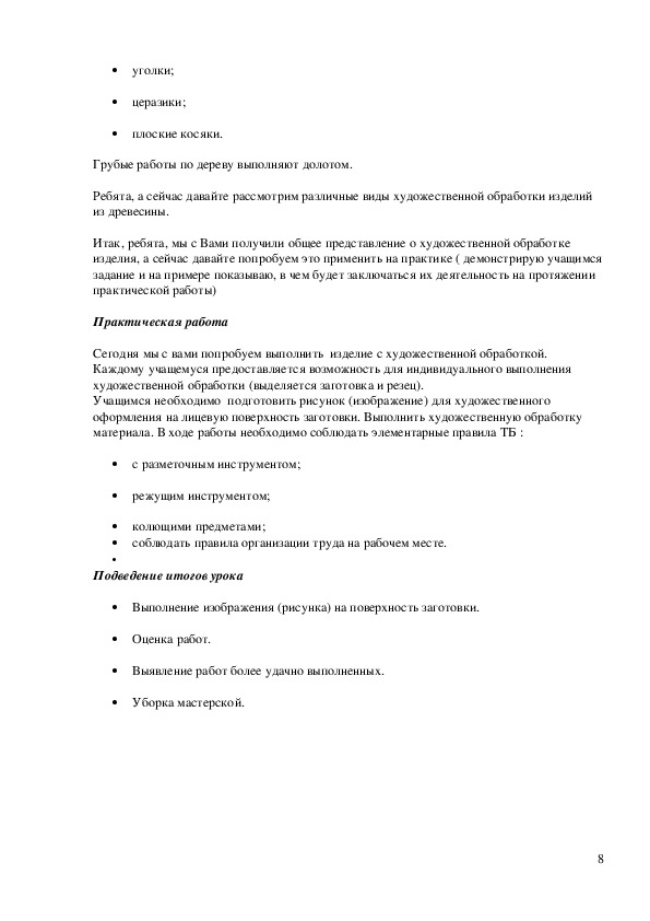 Цель: ознакомить учащихся с видами художественной обработки древесины, способами конструирования изделий и переноса изображений на поверхность заготовки. Ознакомить с приемами выполнения простейших видов художественной обработки изделий.