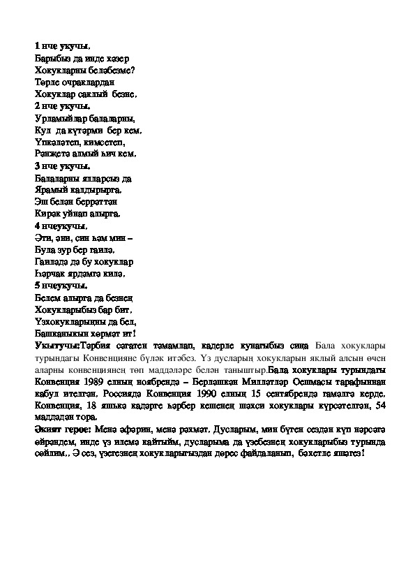 сыйныфтан тыш чара конспекты тәкъдим итәм. Чараның максаты: Балаларны «Бала хокуклары турында конвенция» нең эчтәлеге белән таныштыру; хокук нормаларын өйрәнне әхлак нормалары белән бәйләп аңлату; фикерләү сәләтләрен баету, нәтиҗә ясарга, үз- үзеңе, иптәшләреңне хөрмәтләү хисләре тәрбияләү.