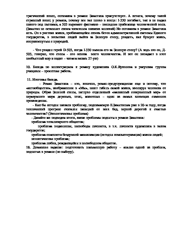 Оборудование: текст романа, компьютерная презентация «Е.И.Замятин», иллюстрации художника О.К.Вуколова, рисунки учащихся.конспект