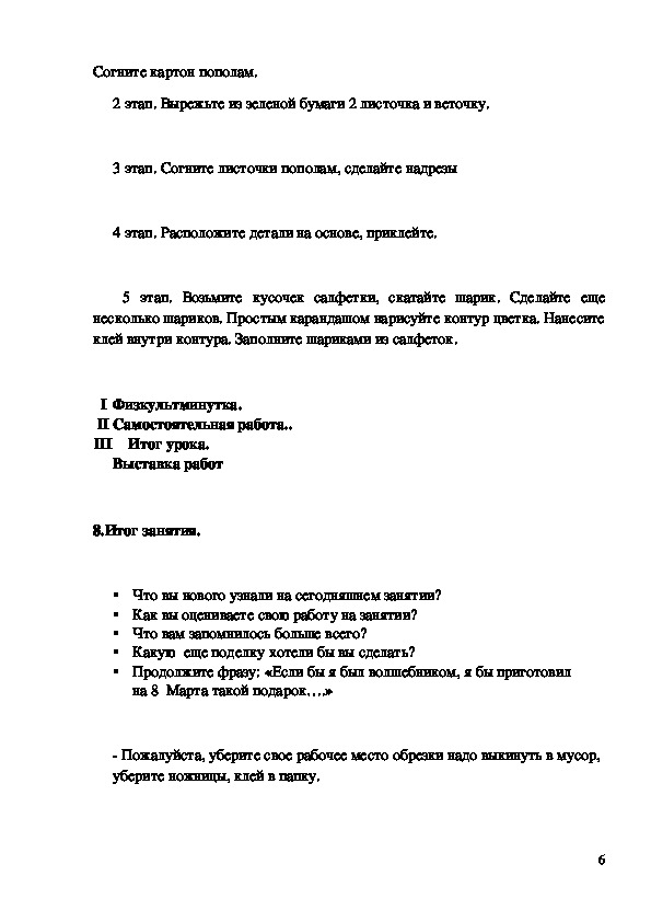 Цель: формирование умений по выполнению аппликации, изготовление объемной открытки к 8 Марта.
