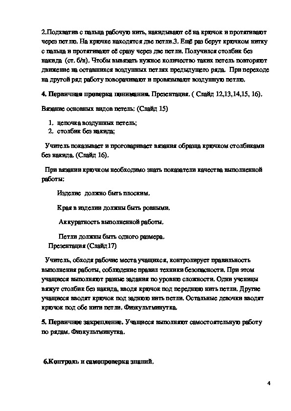 Цели урока: способствовать формированию у учащихся умений вязания образца крючком столбиками без накида и ознакомить детей с понятием столбик без накида .