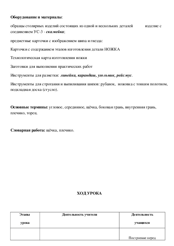 Цель урока: Повторение знаний учащихся о технологических основах и развитие практических навыков изготовления шиповых столярных соединений.