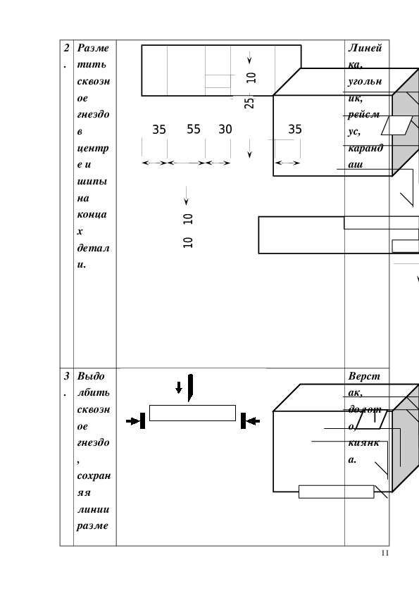 Способствовать развитию умений и навыков разметки и выполнения элементов шипового соединения УС-3 с опорой на имеющиеся знания, умения и навыки разметки и пиления древесины поперёк и вдоль волокон.