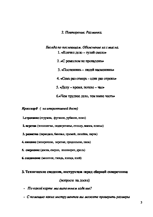 Материалы и оборудование: кроссворд, технологические карты, угольник,