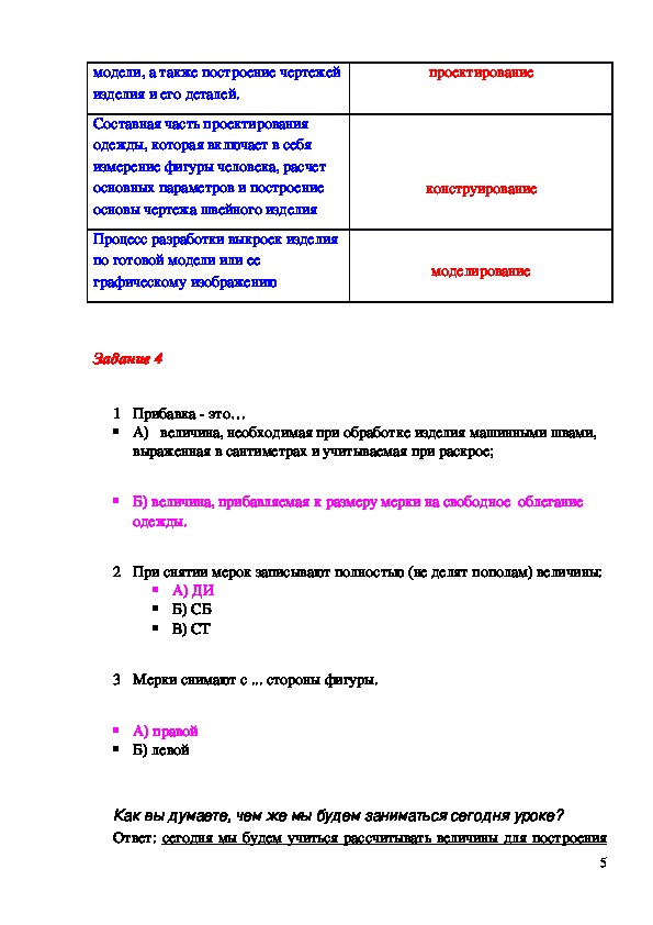 «прибавка на свободное облегание», «масштаб»;