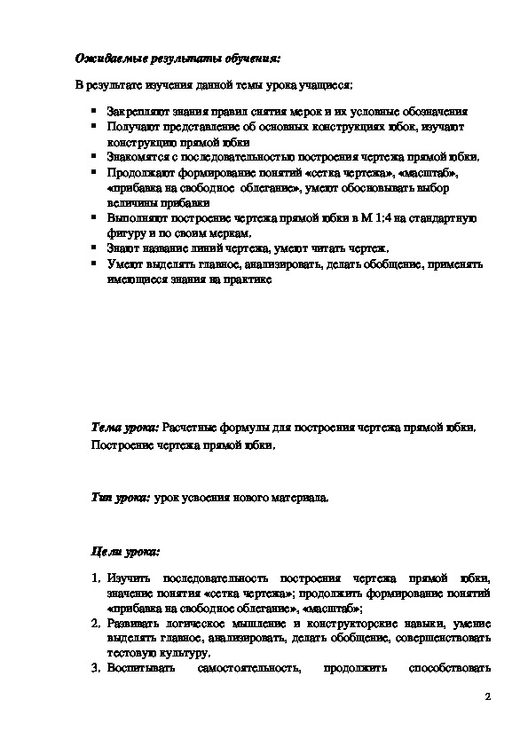 Тема урока: Расчетные формулы для построения чертежа прямой юбки.