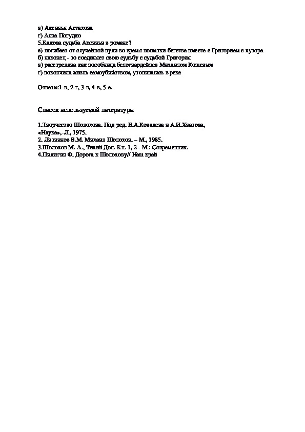 2. Литвинов В.М. Михаил Шолохов. – М., 1985.