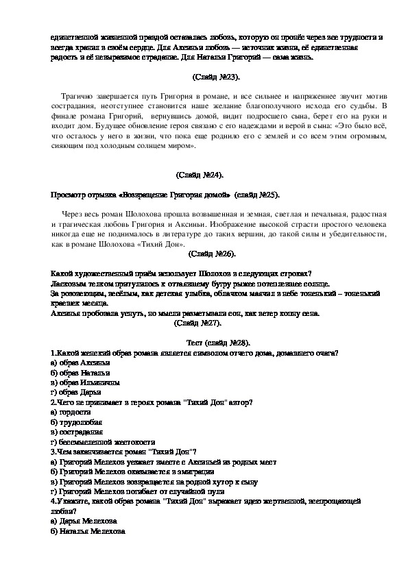 М. Горький.Каждый человек понимает, что такое любовь, по-своему. В романе М.Шолохова раскрываются все грани этого чувства, автор позволяет нам взглянуть на него с разных сторон, помогает понять, что любви нельзя дать однозначного определения. Даже один и тот же человек может чувствовать так по-разному! Ярким доказательством тому является любовь Григория Мелехова, главного героя романаКонспект урока "Какое место в жизни Григория Мелехова занимает любовь?" 11 класс