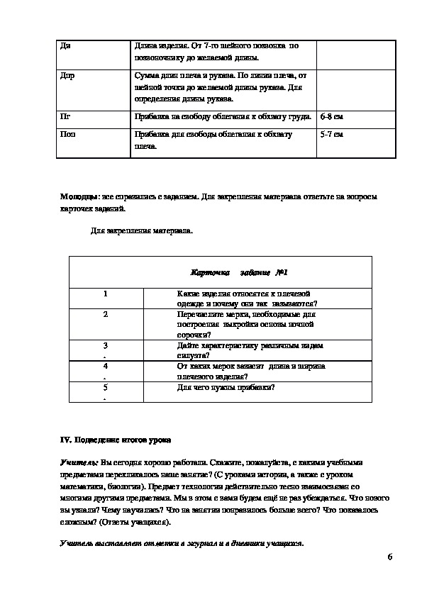 Средства обучения: учебники, раздаточный материал (таблица с мерками, карточки