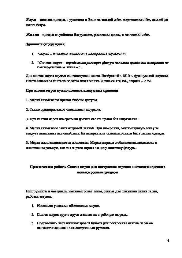 Практическая работа. Снятие мерок для построения чертежа плечевого изделия с