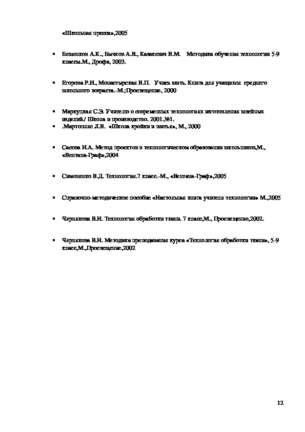 Чернякова В.Н. Технология обработки ткани. 7 класс,М., Просвещение,2002.